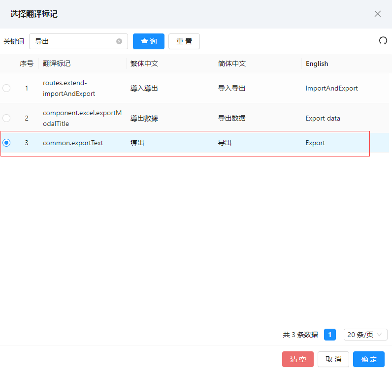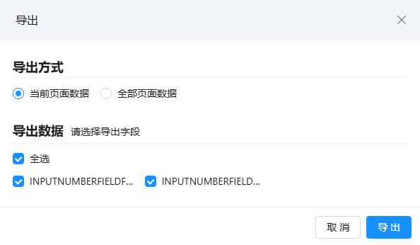- 导出按钮:勾选后列表会显示 “导出” 按钮,支持导出 “当前页”“全部页” 或 “当前选择数据”(需设置视图主键),导出字段可自定义,且按钮文字会随系统语言自动翻译(如简体 “导出”→英文 “Export”);