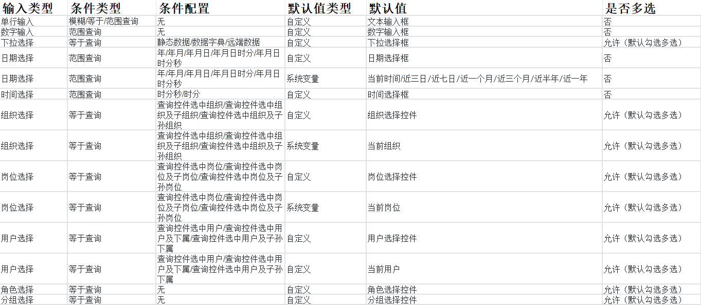 - 自定义查询字段:输入类型可手动选(如 “单行输入”“下拉选择”“日期选择”),且有对应的 “条件类型”(如 “单行输入” 支持 “模糊查询”,“下拉选择” 支持 “等于查询”);