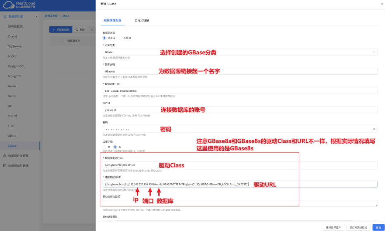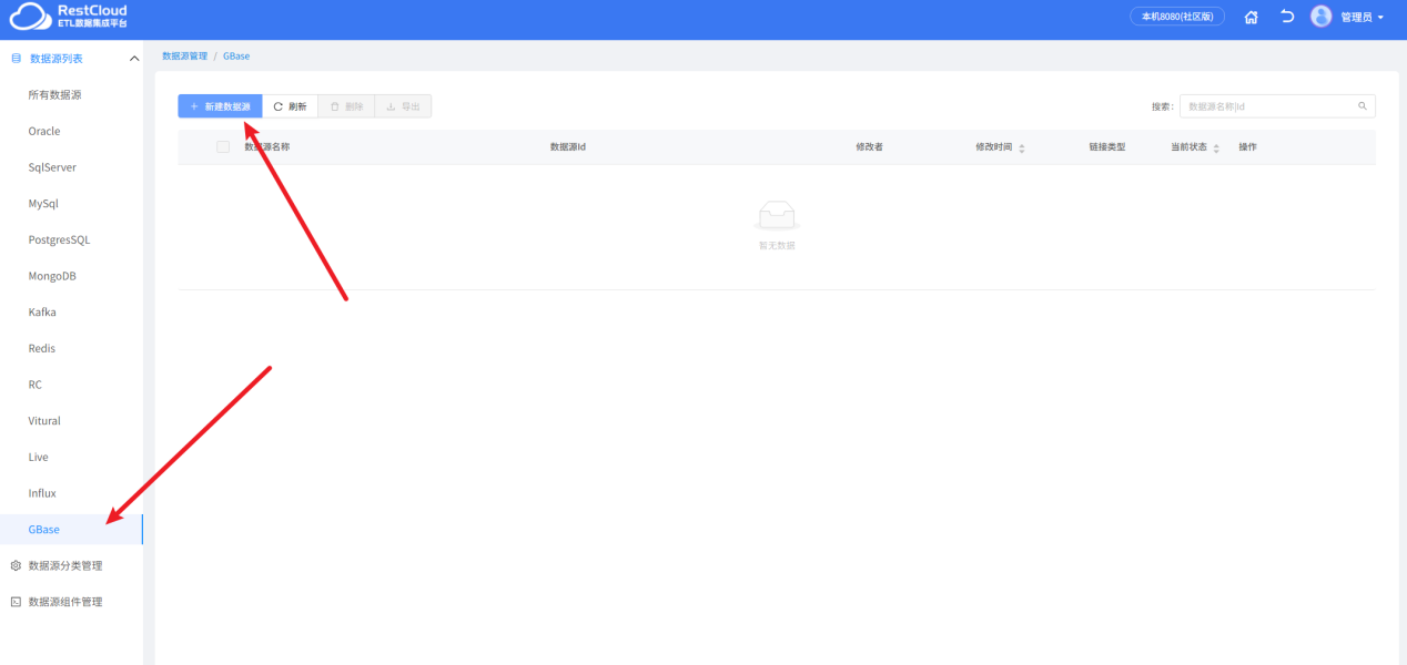 选中创建的 GBase 分类,点击新建数据源。