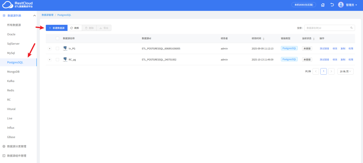 我们要配置两个数据源连接,分别是目标端 GBase 与源端 PostgreSql 的数据源。
