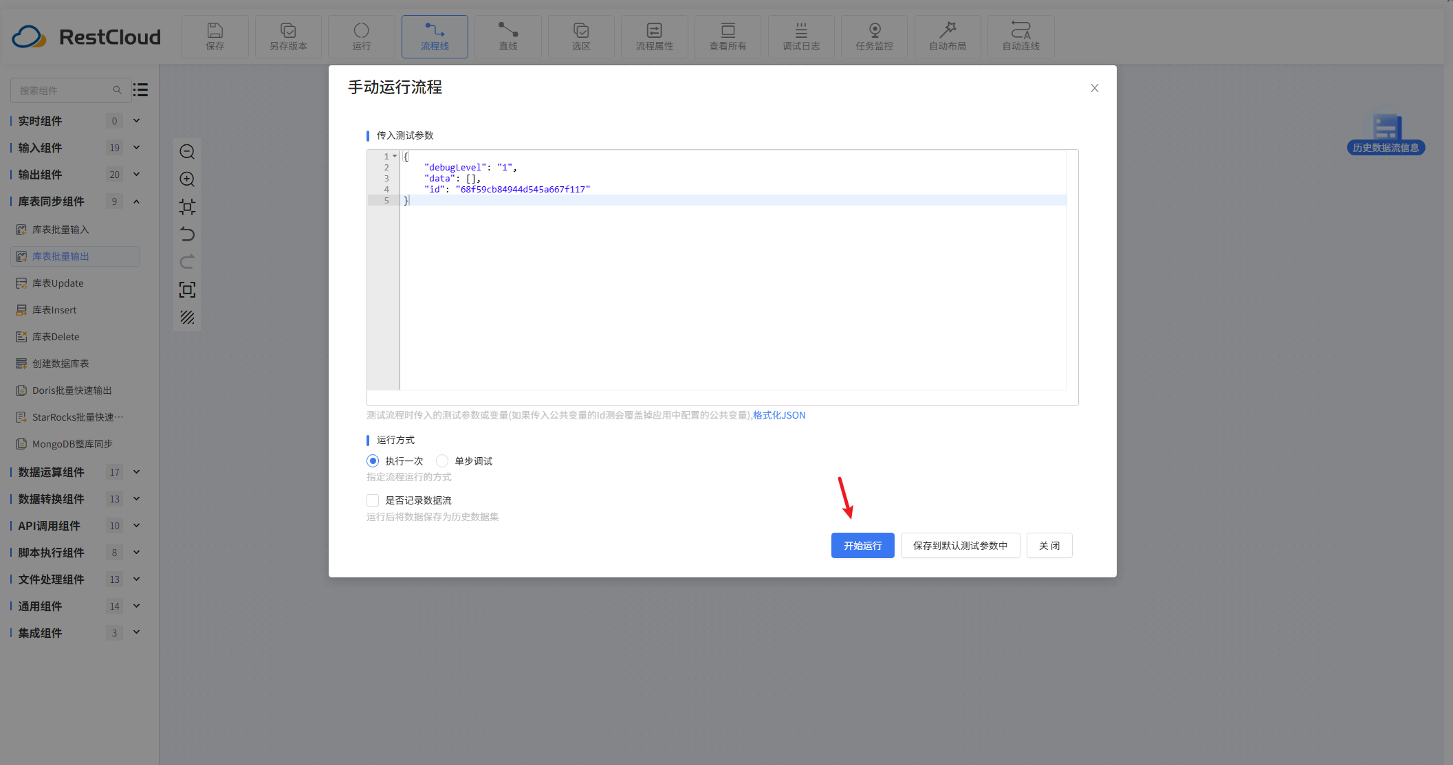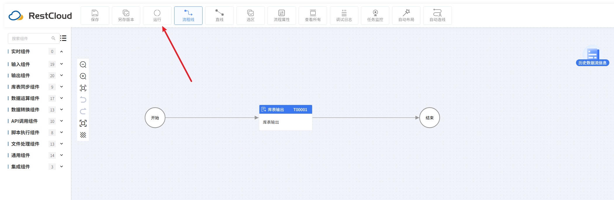配置好流程后,在上方的工具栏里面,找到运行按钮并点击。