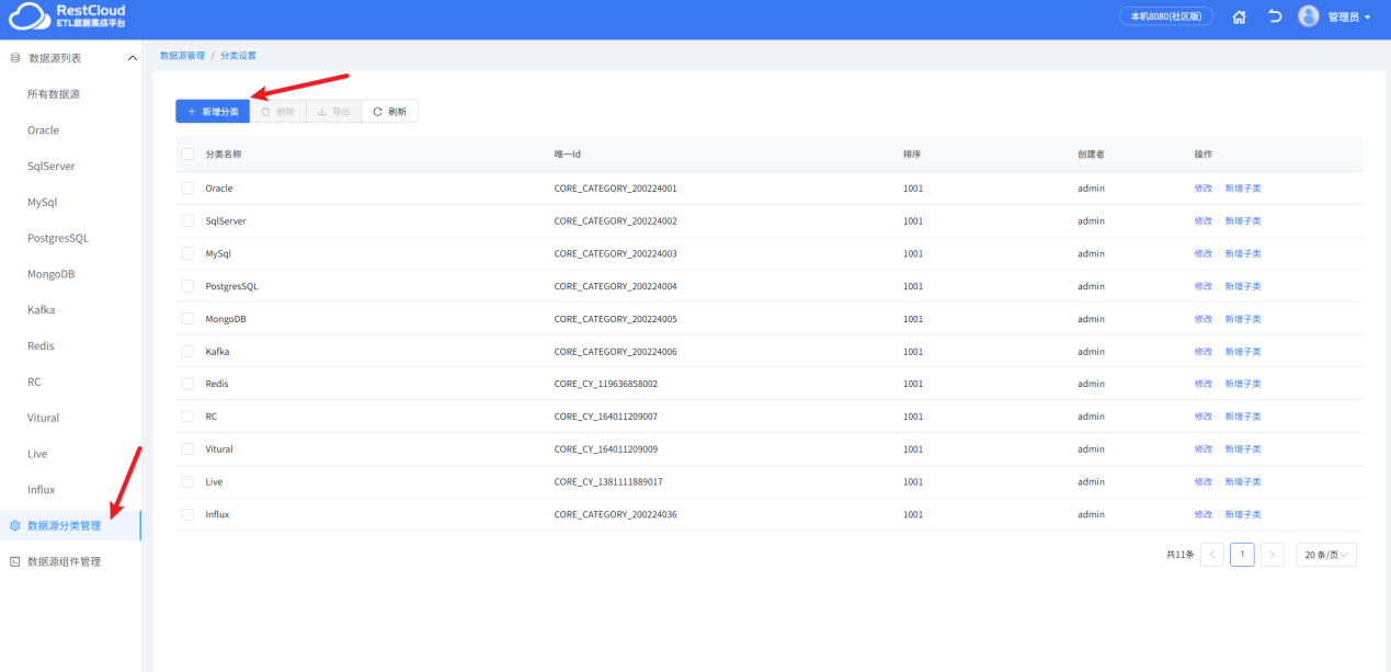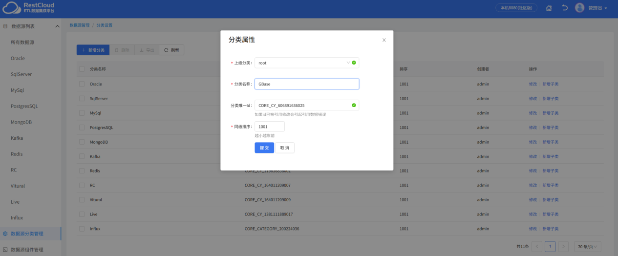 系统初始化只有部分分类,数据源连接必须创建在某个分类下,可以放在任意的分类,为了方便后续数据源的维护,建议将数据源根据数据库类型、环境等维度放在某个分类下,比如 GBase 的数据源就放在 GBase 分类下,但系统默认没有 GBase 分类,我们可以手动创建一个 Gbase 分类。