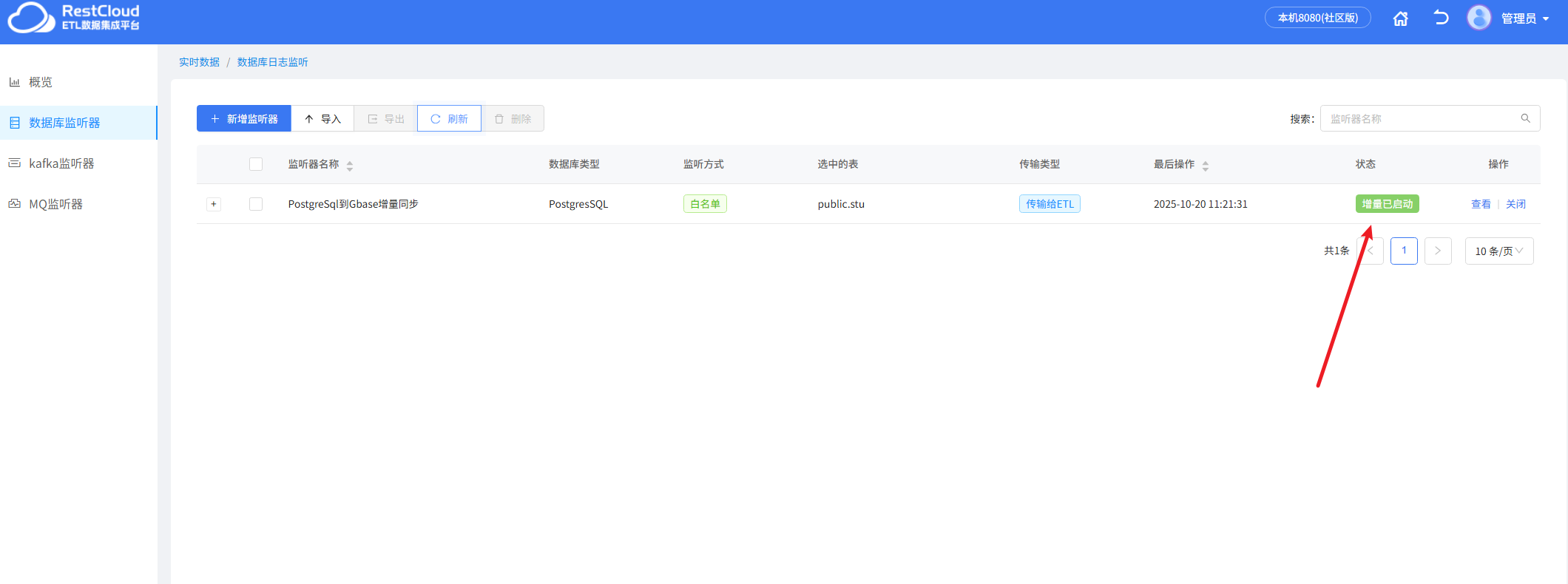 创建好监听器,启动监听器,显示增量已启动证明监听器已经正常启动。