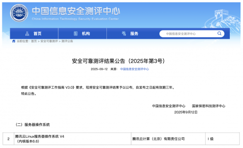 腾讯云 Linux 服务器操作系统(TencentOS Server)V4 (内核版本 6.6)顺利通过测评,并获得安全可靠等级“I 级”。这标志着 TencentOS Server 的产品能力和自主研发实力再一次得到了国家权威机构的认可。