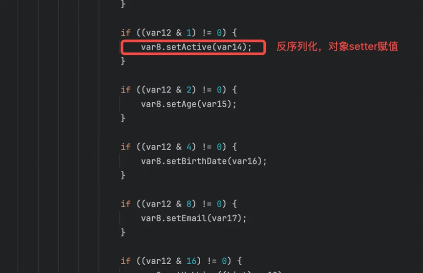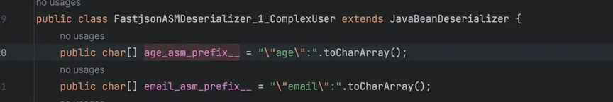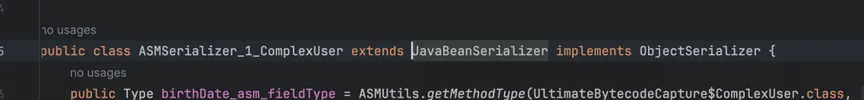 ASM 是 fastjson 类似于 JIT,在运行时把「反射调用」翻译成「直接字段访问 + 方法调用」的字节码,从而把序列化/反序列化性能提升 20% 以上,当然随着 JVM 对反射性能的优化性能差正在逐渐被缩小。下图是作者使用工具类读取的动态序列化/反序列化器源码片段。