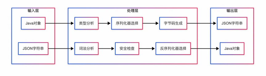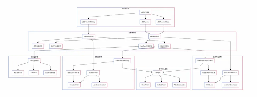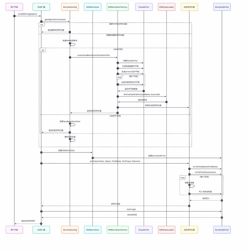 整体上 Fastjson 通过统一的门面 API(JSON.toJSONString/parseObject)调用核心控制器(JSONSerializer/DefaultJSONParser),利用 ASM 字节码生成或反射机制,配合 SerializeWriter/JSONLexer 进行高效的 Java 对象与 JSON 字符串间双向转换,同时提供配置缓存、循环引用检测和 AutoType 安全防护等优化机制。下图为框架处理数据流: