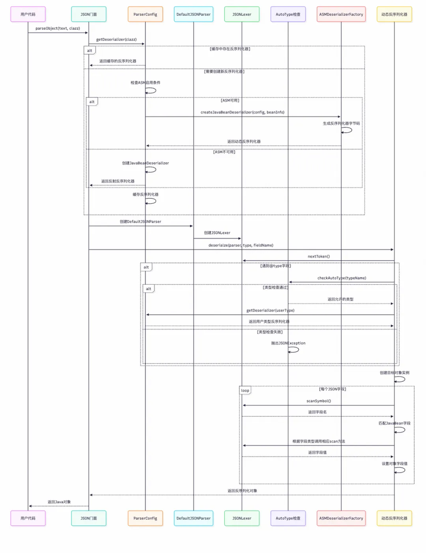 关键类 :DefaultJSONParser.java: 反序列化的核心调度器。它负责解析 JSON 字符串的整个过程,管理 JSONLexer 进行词法分析,并根据 Token (如 { , } , [ , ] , string , number 等)构建 Java 对象。JSONLexer.java / JSONLexerBase.java: JSON 词法分析器。它负责扫描输入的 JSON 字符串,将其切割成一个个有意义的 Token ,供 DefaultJSONParser 使用。JavaBeanDeserializer.java: 默认的 JavaBean 反序列化器。在未启用 ASM 优化时,它通过反射创建对象实例并设置其属性值。ASMDeserializerFactory.java: 与序列化类似,它动态生成反序列化器字节码,直接调用 setter 方法或直接对字段赋值,避免了反射。ObjectDeserializer.java: 反序列化器接口。用户可以实现此接口来自定义特定类型的反序列化逻辑。ParserConfig.java: 反序列化配置类。维护了 Java 类型到 ObjectDeserializer 缓存,并负责管理 ASM 生成的类的加载。Feature.java: 反序列化特性枚举,用于控制解析行为。
