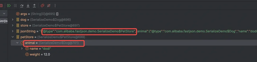 在未开启 AutoType 机制情况下,在将 store 对象序列化成 JSON 串后,再反序列化为对象时由于字段的类型为接口无法转换成具体的 Dog 类型示例;开启 AutoType 机制后,序列化时将类型一并写入到 JSON 串内,后续进行反序列化时可以根据这个类型还原成具体的类型实例。