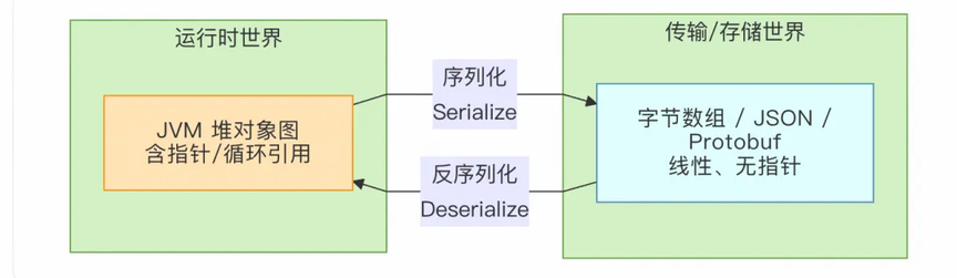 对象在“内存世界”里活得很好,但只要一离开进程地址空间(网络、磁盘、数据库、浏览器、异构语言),就必须先打成包裹(序列化),到对岸再拆包裹(反序列化)。