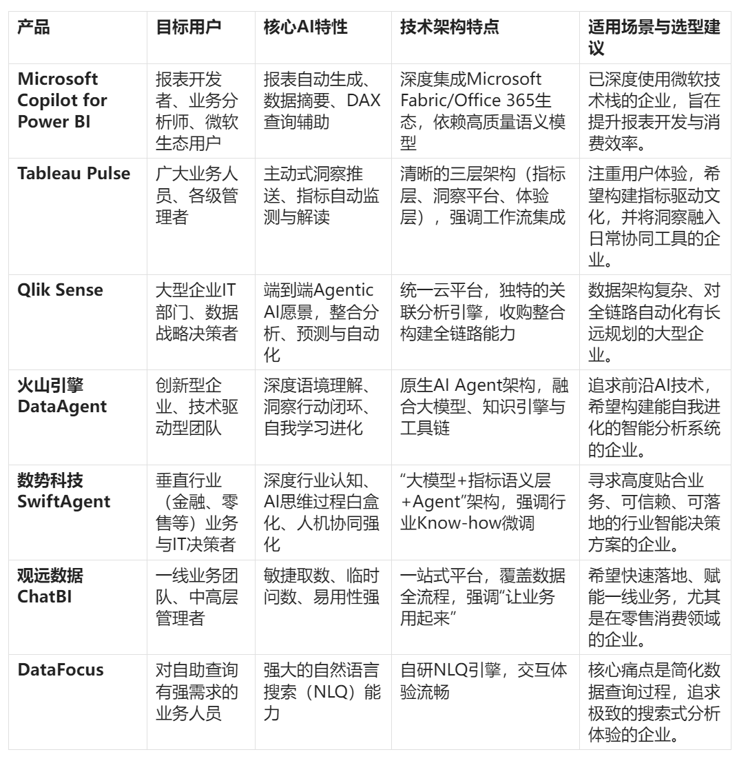 产品格局:国际巨头(微软、Tableau、Qlik)以生态和平台见长,国内新锐(火山引擎、数势、观远、DataFocus)则在敏捷和场景深耕上更具优势,企业应根据自身需求和技术栈进行选型。