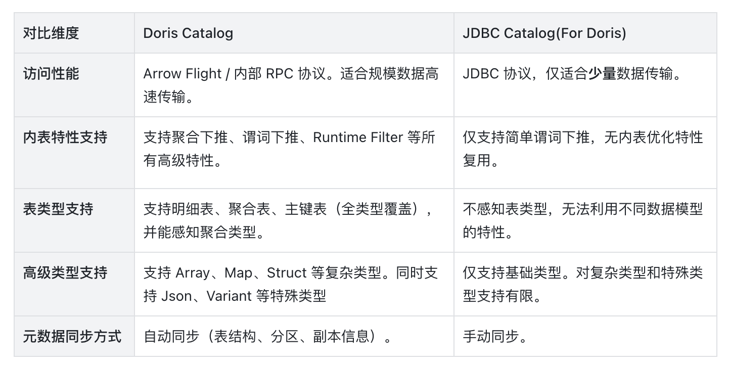 那么,与 JDBC Catalog 相比,Doris Catalog 到底具备哪些能力优势呢?