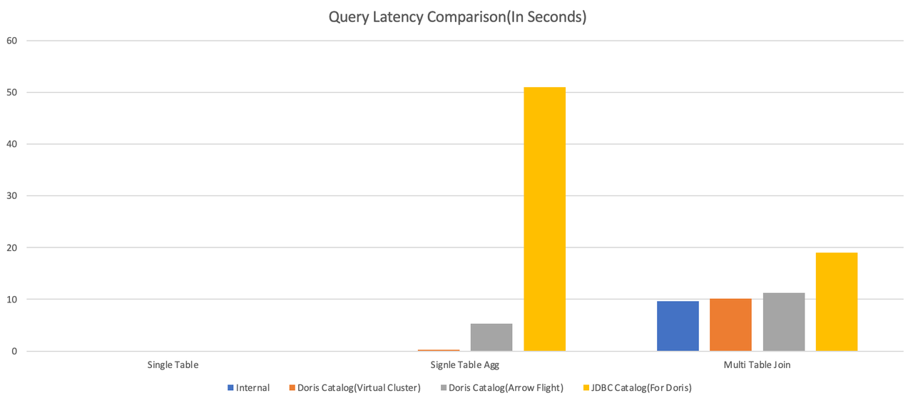 结果显示,在涉及聚合、Join 等复杂查询场景下,Doris Catalog 相比 JDBC Catalog 展现出不同程度的性能优势。其中,在单表聚合查询场景下优势尤为突出:Doris Catalog(虚拟集群)的查询耗时仅为 0.21 秒,相较于 JDBC Catalog,速度提升超过 200 倍。