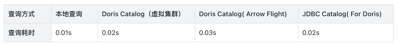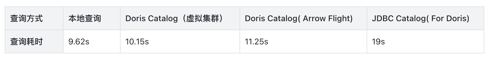 在多表关联查询(两个大表分别存储在本地和远端集群,进行关联查询)模式下:Doris Catalog 两种模式均优于 JDBC Catalog,相较于 JDBC Catalog,速度提升约 42%。