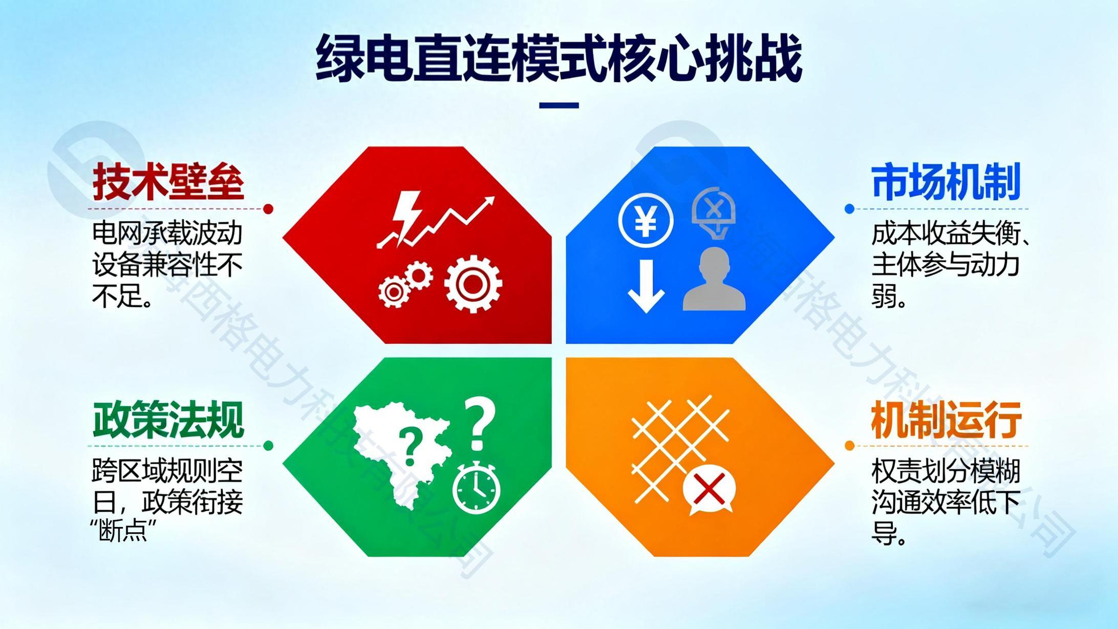 权责划分模糊与沟通机制缺失:绿电直连涉及多方主体,多方主体的权责边界尚未完全厘清,尤其是在风险承担与责任认定上存在争议。当绿电直连出现故障(如电网波动导致用户断电、绿证交付延迟影响用户低碳认证)时,责任往往难以界定, 这种 “权责模糊”,增加了直连项目的运营风险,也降低了主体间的信任度。