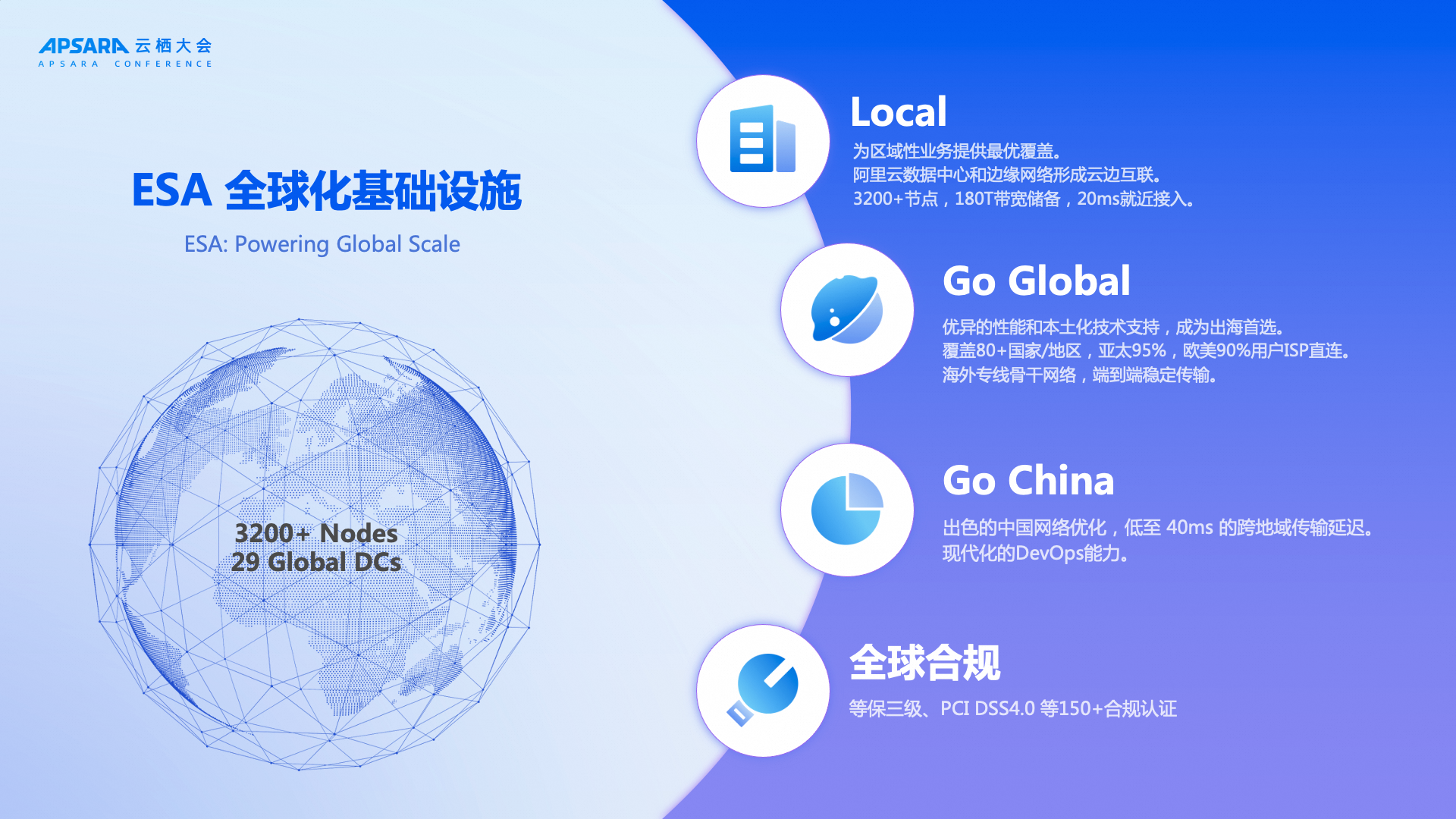 服务本地用户:以阿里云 29 个数据中心为核心辐射全球,以“云边协同、全球覆盖”的网络架构,实现就近接入与低时延高稳定体验。