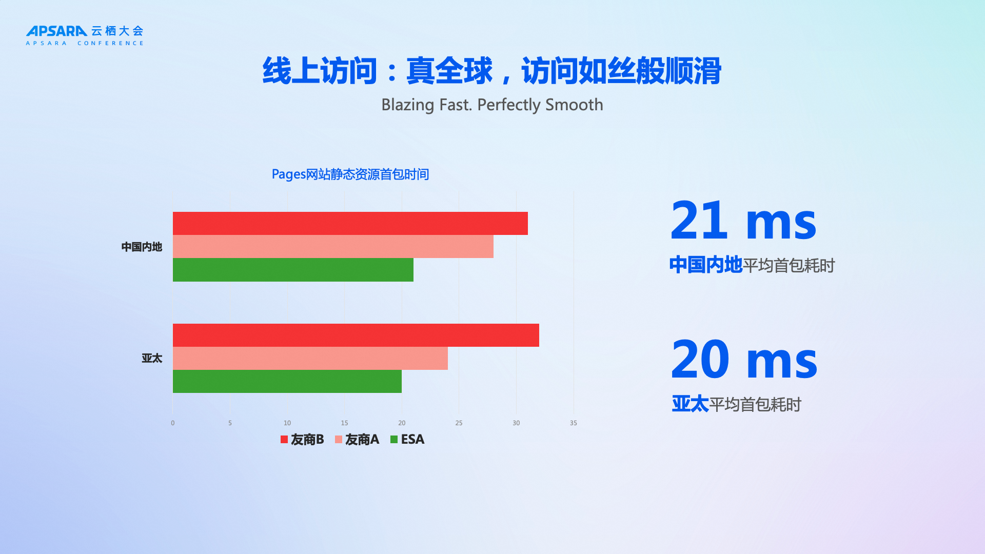 根据第三方波测数据显示,阿里云 ESA Pages 在全球范围的首包时间(TTFB)与整页加载时长均显著领先,亚洲地区凭借密集基础设施优化甚至优于大陆境内访问时延。实践对比中, 典型页面可见约 30% 的加载时间领先幅度。