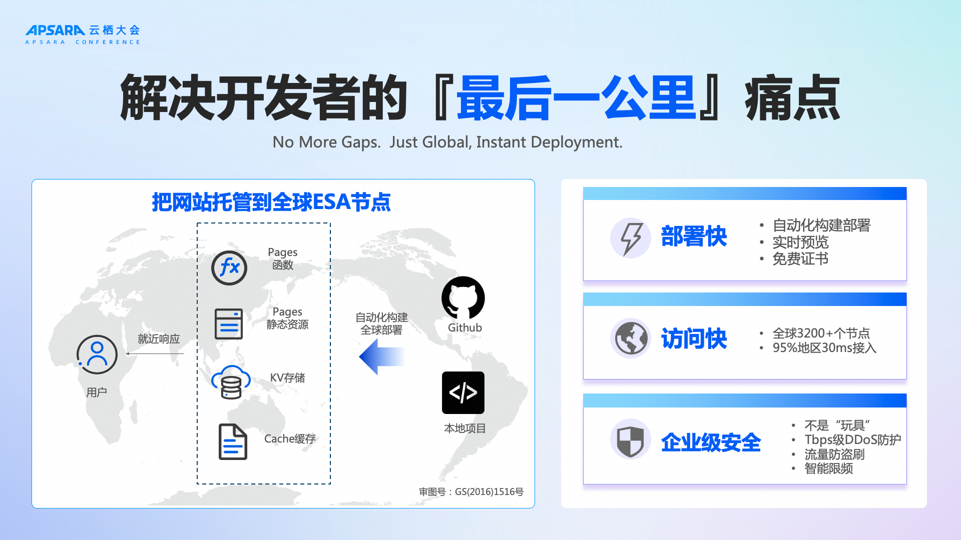 在今年的云栖大会上,阿里云边缘安全加速 ESA 宣布发布边缘开发平台“ 函数和 Pages ”。这是国内首个边缘开发平台的一次重大升级,对标国际同类产品的同时,更以“边缘原生、企业级安全、全球可达”的标准,系统性的重塑从开发到部署、从运维到安全的全链路体验与效率边界,为中国开发者提供与国际同类产品对标且更贴近本土实践的落地路径。阿里云 ESA “ 函数和 Pages ”以统一的边缘控制平面为底座,将站点托管与事件驱动的边缘函数原生打通和全球加速、CDN 缓存、智能路由、DNS、规则引擎与安全策略体系无缝编排。开发者可通过 GitHub 等代码托管平台一键集成,配合编码 Agent 实现从需求描述到构建、预览、灰度、回滚直至全球上线的全自动流水线,显著缩短“开发几小时、部署几天”的周期,实现分钟级交付。