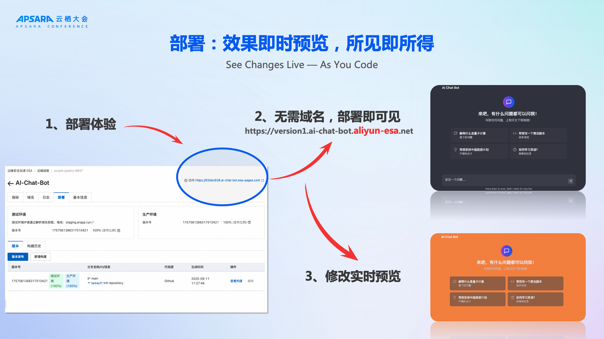 • 即时预览:每次部署生成独立预览 URL ,所见即所得调试,满意后再绑定自有域名。