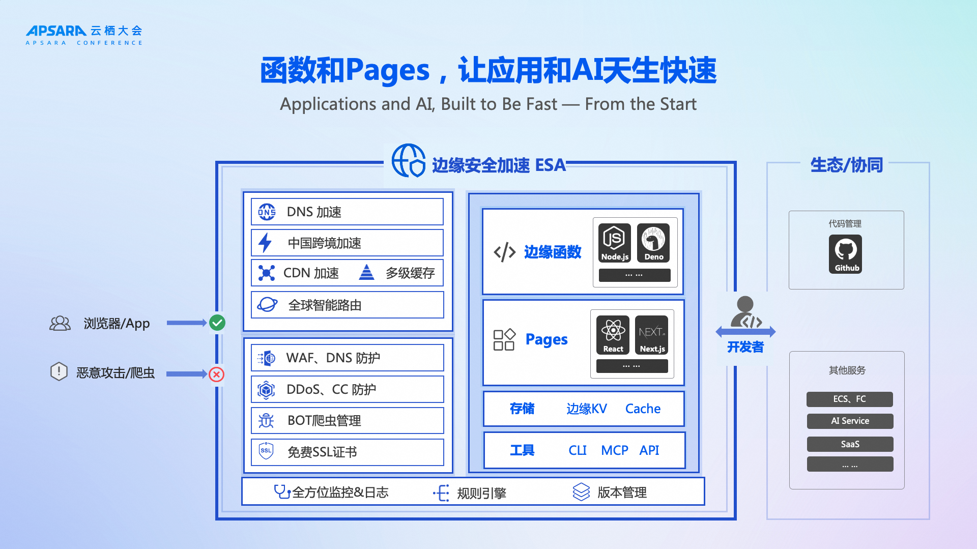 全新的阿里云 ESA “函数和 Pages ”以高性能、低时延为特征,并以可观测、安全与自动化运维为基线,让代码和 AI 在边缘绽放。