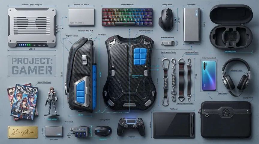 [Art Style & Viewpoint]:Hyper-realistic 8k product photography, macro lens perspective, strict 90-degree overhead flat-lay (knolling).[Aesthetic Philosophy]: "Sublime Micro-Engineering Narratives". A blend of surgical precision and artistic interpretation of technical components.[Subject Input]:Target Object: [生成hacker的背包,二次元爱好者的行李[INTELLIGENT SCENE GENERATION WORKFLOW]:>>> OPTION A: IF Subject is Mechanical / Tech / Masculine (Industrial Precision Mode)[Action]: Forensic Technical Exploded View. Disassemble into 8-12 primary components, but with an emphasis on secondary and tertiary sub-components (e.g., individual gears within a gearbox, micro-switches on a circuit board, specific spring types, internal wiring harnesses).[Detail Emphasis]: Each component is meticulously rendered.Metals: Highlight brushed grains, polished edges, anodic oxidation sheen, laser-etched serial numbers or specific alloy markings. Show microscopic tolerances between parts.Plastics: Reveal injection molding marks, precise seam lines, and subtle textural variations.Circuitry: Emphasize the solder joints, traces, tiny capacitors, and integrated chip details.Glass/Optics: Render reflections, anti-reflective coatings, and subtle refractions.[Background]: Premium matte cool-grey workbench surface.[Interactive Schematics]: Ultra-fine Cyan/Tech-Blue vector lines. Include cross-sectional views, exploded assembly sequence lines (dashed arrows), and material call-outs(e.g., "Alloy 7075", "Carbon Fiber Weave").[Artistic Title Style]: "Industrial Stencil" Aesthetic. Large, bold, semi-transparent text(e.g., "PROJECT: ALPHA" or "ENGINE MODEL: X9") laser-etched onto the background surface.>>> OPTION B: IF Subject is Feminine / Fashion / Lifestyle(Luxury Narrative Mode)[Action]: Curated "Magic Blind Box" Knolling. Spilled contents are arranged with obsessive attention to detail for each item.[Detail Emphasis]: Each item, whether essential or "secret," is presented with luxurious verisimilitude.Fabrics: Reveal intricate stitching on leather, delicate lace patterns, silk's natural sheen, and fine thread counts.Cosmetics: Show the micro-pearls in a compact, the smooth texture of a lipstick bullet, the subtle viscosity of a serum.Jewelry: Highlight facets of gemstones, polished metal reflections, and delicate clasps."Secrets": Render silicone textures, subtle glow of LED indicators on personal wellness devices, or the elegant folds of intimate garments with tasteful artistry.[Background]: Iconic Tiffany Blue(Robin-egg blue) matte surface.[Interactive Schematics]: Delicate White or Silver fine lines. Include fashion pattern diagrams, stylistic flow lines(emphasizing elegance), and "signature" curves(e.g., golden ratio spirals) across the composition.[Artistic Title Style]: "Vogue Editorial" Aesthetic. Elegant, oversized Serif Typography(e.g., "THE ENSEMBLE" or "FEMME FATALE") in shimmering silver foil or embossed white ink on the blue surface.[Universal Composition]:Mathematical grid alignment with micro-gaps for hyper-precision. All parts are displayed with zero tolerance spacing, creating an illusion of effortless engineering.[Universal Lighting]:Micro-detailed, multi-point studio lighting. Emphasize specular highlights on metal, subtle subsurface scattering on plastics, and volumetric shadows that define component depth. Neutral color balance.[Graphic Elements - The "Call-out" System] (Enhanced):Style: Ultra-fine Hairline Pointers(Leader Lines).Text Detail: [Bold Main Label - e.g., "Cylinder Block"] / [Tiny Sub-Label - e.g., "Aluminium Alloy 7075, Forged"] / [Micro-Spec - e.g., "Tolerance +/-0.005mm"]. This creates tiered information.Font: Swiss-style minimalist sans-serif for clarity. Text appears digitally superimposed, razor-sharp.[Artisan Signature Plaque] (Universal):In the bottom-left corner: A small, highly realistic, rectangular golden metallic plaque.Text: "canghe" in natural, elegant handwritten cursive script.Effect: Deeply engraved/debossed look with complex metallic sheen and subtle light traps, contrasting with the technical precision.--ar 16:9 --q 2 --stylize 450 --v 6.1