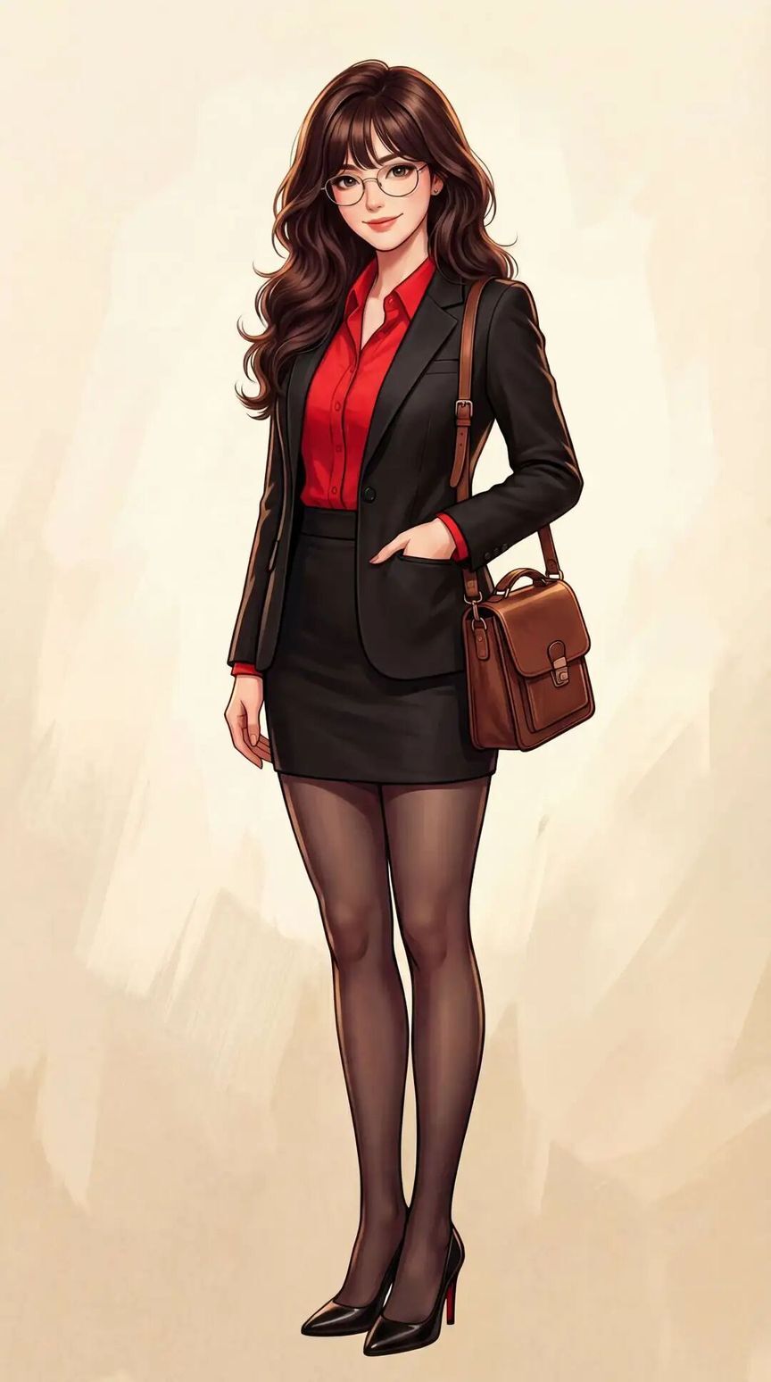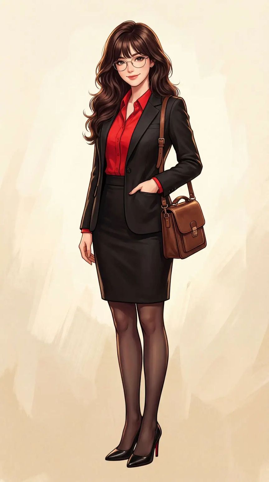 一张高质量的女性角色立绘,精致的韩漫厚涂风格。画面中是一位干练自信的职场御姐,她有着深棕色的大波浪长卷发,留着空气刘海,戴着一副精致的金属细框眼镜,眼神知性且迷人,嘴角带着自信的微笑。她身穿剪裁合体的黑色修身西装外套,内搭鲜红色的翻领衬衫,下身是黑色包臀短裙搭配黑色透肉丝袜,脚踩黑色尖头红底高跟鞋。她单手插在西装口袋里,肩上挎着一个复古棕色的皮革邮差包,站姿优雅挺拔。背景为米黄色的纸质纹理,光影柔和,高分辨率,细节丰富,尺寸:9:16,画质4k