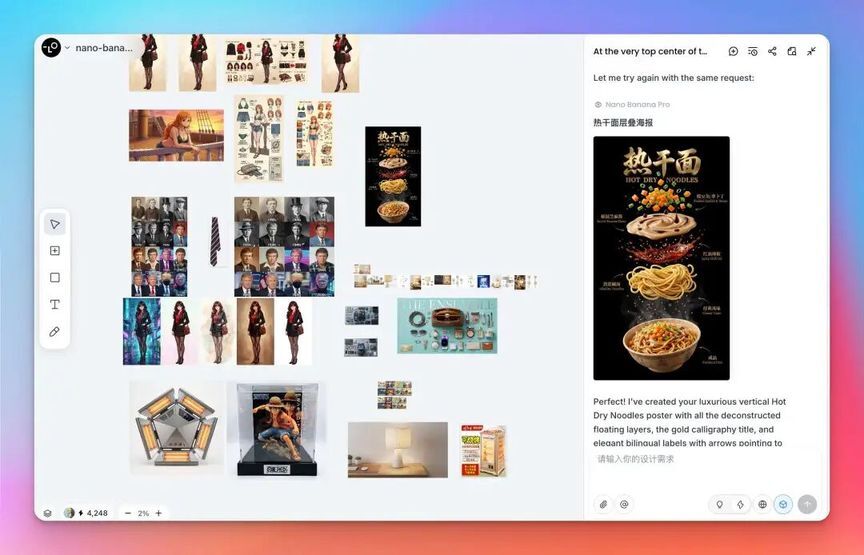 除了生成热干面,还可以生成任意食物,把他丢给 Lovart,然后直接跟他说就好了。