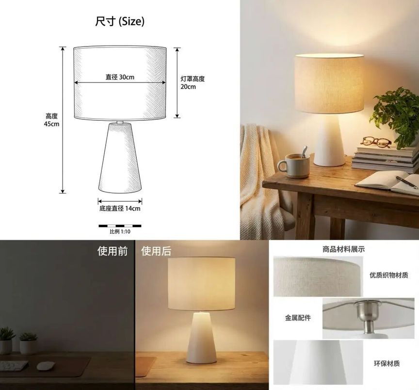 提示词:把【图 1】按照【图 2】的介绍,生成产品促销图,文字需要符合台灯这个产品描述,中文描述。