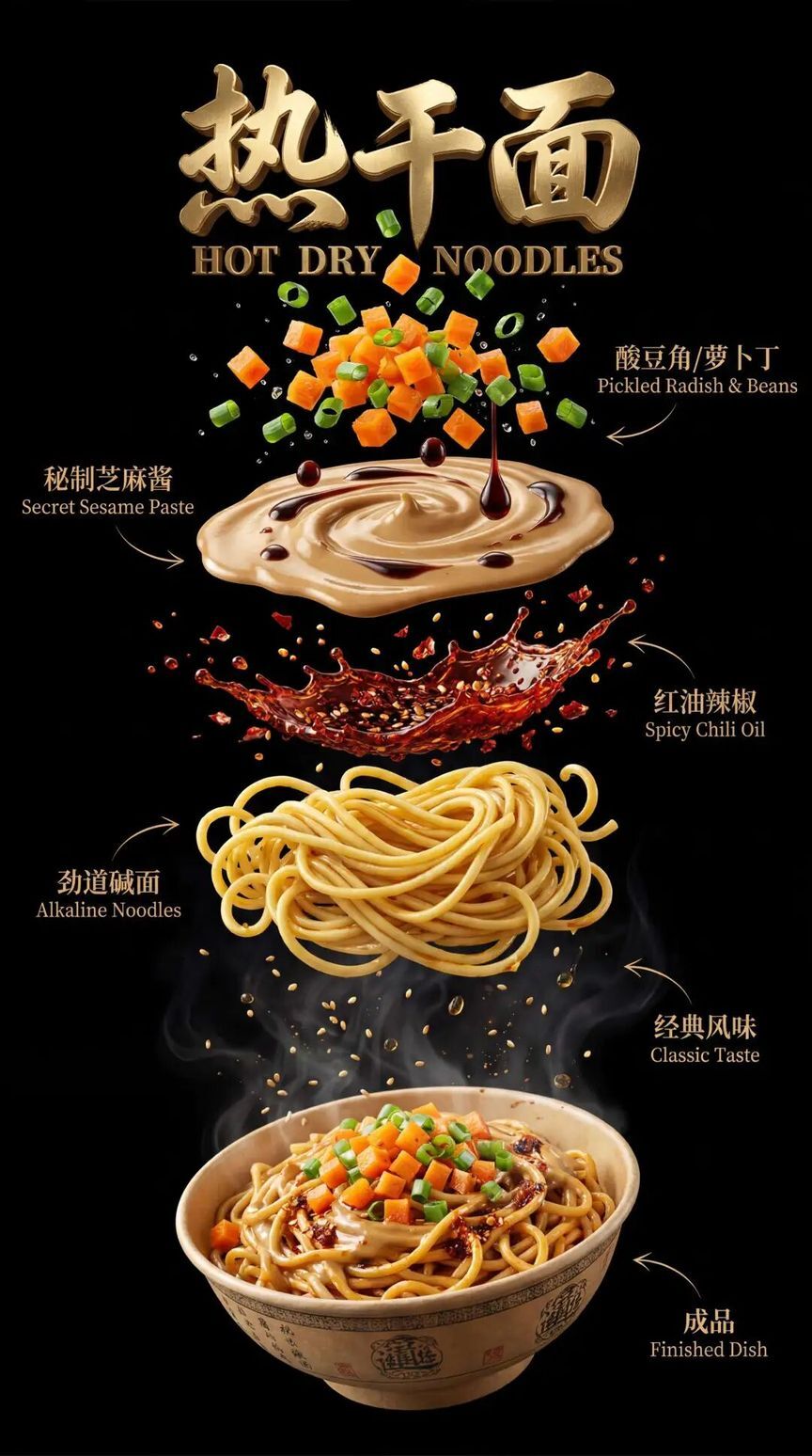 At the very top center of the composition, floating prominently above the ingredient layers, is a luxurious title label. The text reads "热干面 HOT DRY NOODLES" rendered in expressive, handwritten Chinese brush calligraphy (毛笔字) style. The lettering possesses a heavy, three-dimensional sculpted gold metal texture with a brushed finish, warm golden sheen, and realistic metallic reflections catching the dramatic studio lighting.Premium Wuhan street food poster featuring deconstructed layers of Hot Dry Noodles floating in vertical stack on pure black background (#000000). Distinct layers from top to bottom (below the main gold title):1. Top layer: A vibrant mix of orange crunchy pickled radish cubes (spicy diced radish) and bright green chopped scallions, scattered dynamically. 2. Second layer: Rich, thick brown sesame paste (Sesame & Peanut Sauce) floating in mid-air, looking creamy, dense, and glossy, with a few drops of dark soy sauce swirling within it. 3. Third layer: Deep red spicy chili oil splashing, with visible chili flakes and floating sesame seeds, creating a sharp color contrast. 4. Fourth layer: Thick yellow alkaline noodles (oil-coated noodles), coiled and suspended, showing a firm, chewy texture and oily sheen. 5. Fifth layer (Transition): EMPTY SPACE - a larger gap with only subtle rising steam, floating sesame seeds, and tiny oil droplets creating breathing room. 6. Bottom/Final layer: A complete finished Hot Dry Noodles dish in a classic paper bowl or retro ceramic bowl, viewed from the same 45-degree angle. The noodles are thoroughly coated in the thick brown sesame sauce, topped generously with the pickled radish and scallions. The texture looks sticky, rich, and dry (not soupy), with steam rising.Each layer separated with gaps revealing textures. Chinese and English bilingual labels with elegant arrows pointing to each component: "酸豆角/萝卜丁 Pickled Radish & Beans", "秘制芝麻酱 Secret Sesame Paste", "红油辣椒 Spicy Chili Oil", "劲道碱面 Alkaline Noodles", "经典风味 Classic Taste", "成品 Finished Dish".NO white pedestal. All layers float freely in space. Dramatic studio lighting from 45-degree angle, rim lighting highlighting the gloss of the sesame paste and the texture of noodles. Ultra-realistic, 8k resolution, commercial food photography, appetizing, 9:16 vertical format.
