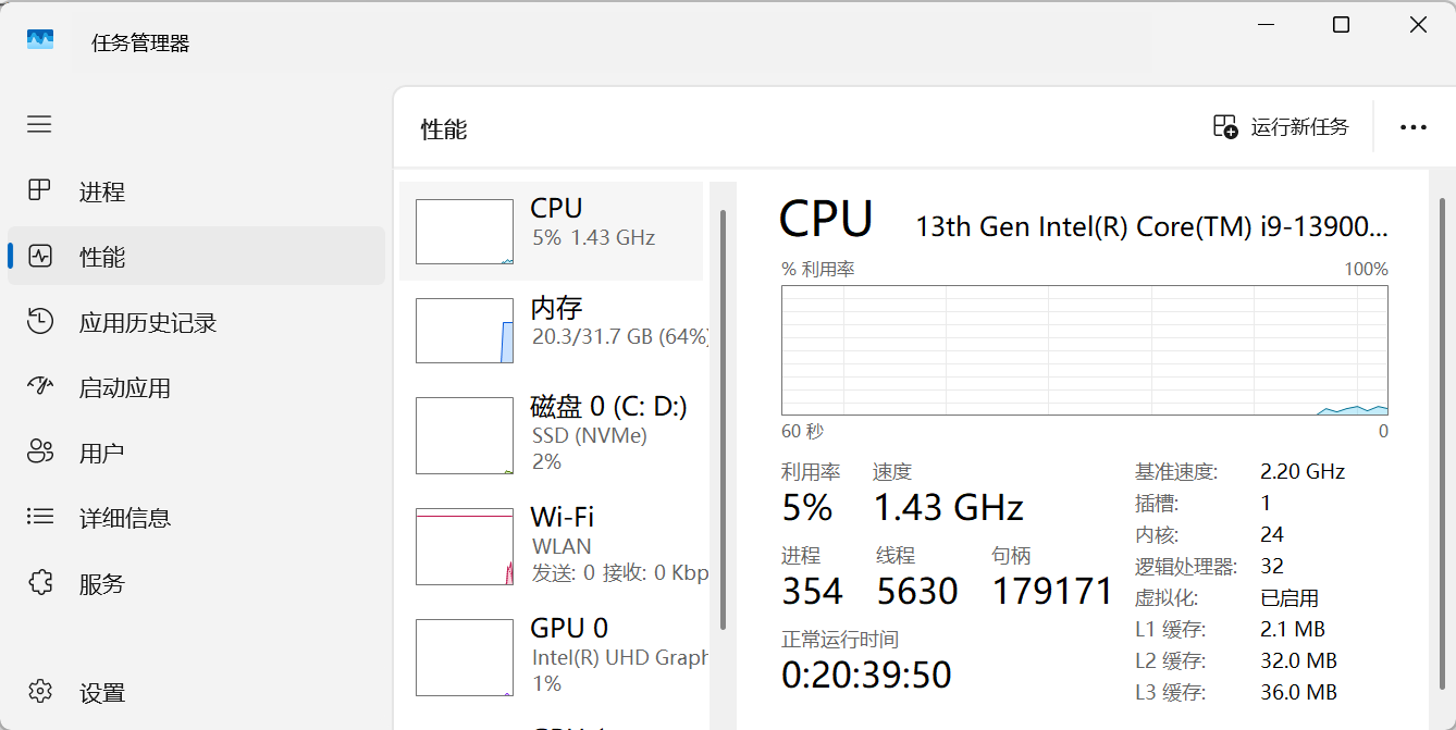 如上图所示:每个性能核(Performance-core)有 2 个线程,能效核(Efficient-core)有 1 个线程,总计:8 x 2 + 16 x 1 = 32 。即 “一个物理 CPU Core i9-13900HX 有 24 个内核,32 个线程”,或者说 “一个物理 CPU Core i9-13900HX 有 24 个内核,32 个逻辑 CPU”。