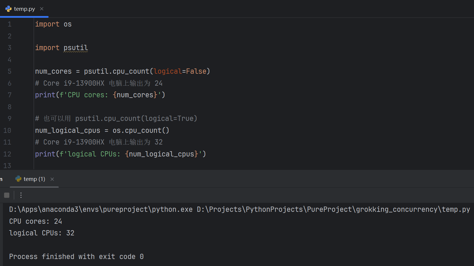 如上所述:psutil.cpu_count(logical=True) 获取的“逻辑 CPU(logical CPUs)”的数量,psutil.cpu_count(logical=False) 获取的“物理内核(Physical core)/内核(Cores)”的数量。