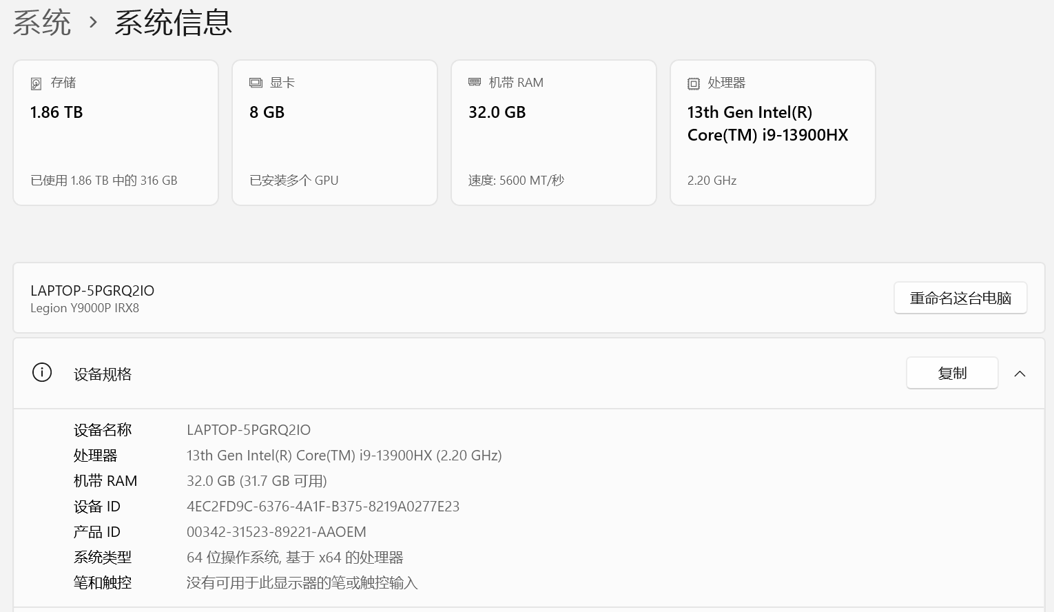 如上图所示:我的联想拯救者(Y9000P)电脑有 1 个物理 CPU(处理器),型号是 Core i9-13900HX。