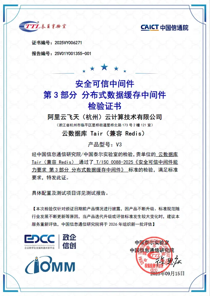 近日,由中国信通院主办的 2025(第五届)数字化转型发展大会在京举行。会上,“阿里云应用服务器软件 AliEE”、“消息队列软件 RocketMQ”、“云数据库 Tair”三款产品成功通过中国信通院“安全可信中间件”系列评估,成为首批获此认证的中间件产品。