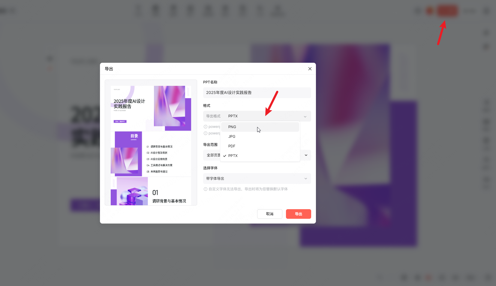 在线完成对 PPT 的编辑后,一方面可通过链接,将 PPT 分享给其他人,这种方式支持多人在线查看或协同编辑,另一方面,博思 AIPPT 支持将 PPT 导出下载到本地,点击编辑器右上角的“分享”,打开导出面板,选择导出格式,默认为 PPTX,可更改为 PNG/JPG 图片格式,再点击右下角的导出,就能将当前 PPT 文件下载到本地,方便离线查看或共享。