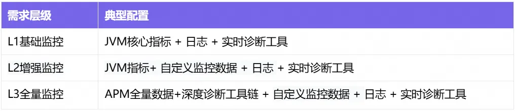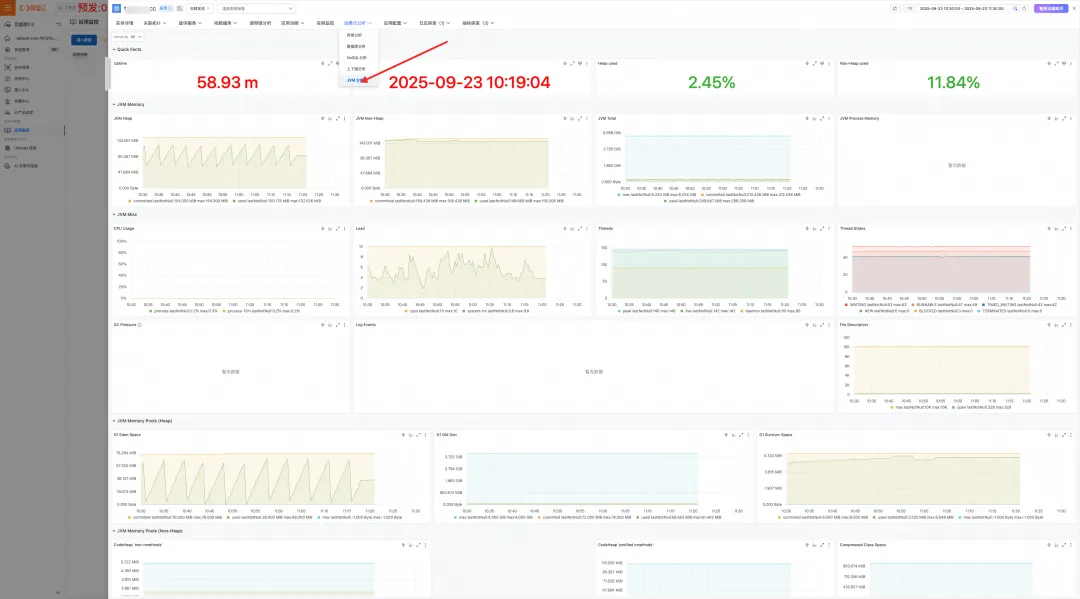 基础监控诉求:对于测试、预发、非核心应用、成本敏感等场景,基础 JVM 监控指标(如堆内存、GC 行为)结合轻量化诊断能力(内存 Dump、持续性能剖析、Arthas 实时诊断)即可满足多数线上问题排查诉求。