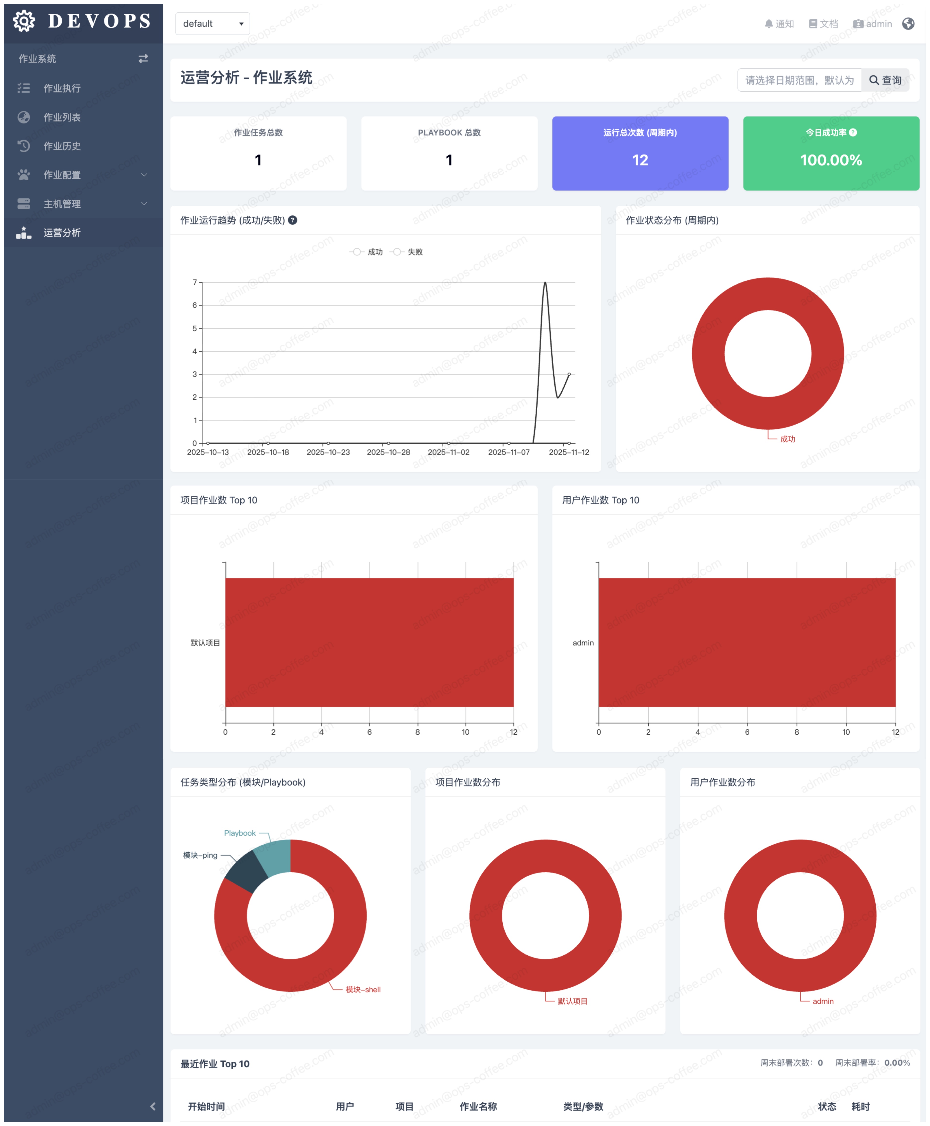 核心介绍:汇总平台数据,从全局视角展示自动化平台的运营健康度。包括:作业成功率趋势、失败率 Top10 的作业、执行最耗时的作业、最常被执行的剧本、自动化覆盖的主机比例等。