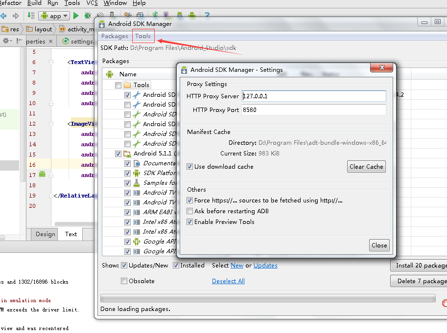 Android SDK Manager 中设置代理,Tools --> Options ... ?并且将?Force https://... sources to befetched using http://?选中,勾中 Enable Preview Tools 是指允许启用预览工具: