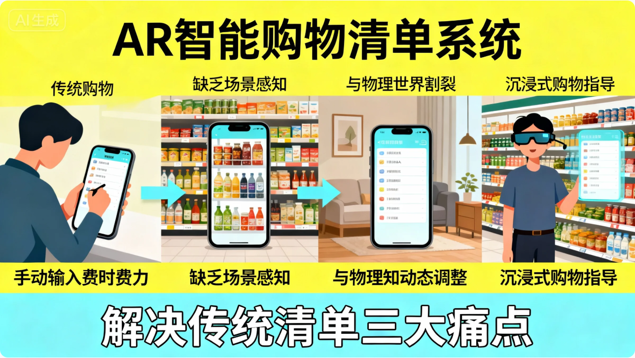 传统购物清单应用普遍存在三大痛点:一是需要手动输入,费时费力;二是缺乏场景感知能力,无法根据实际需求动态调整;三是与物理世界割裂,无法提供沉浸式的购物指导。而基于 AR 眼镜的智能购物清单系统,正是解决这些痛点的创新方案。
