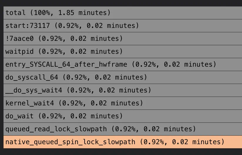 从热点火焰图上我们看到热点最高的是native_queued_spin_lock_slowpath 函数,初步判断这是等锁,是受害者第一现场,点击热点函数,火焰图中可以高亮显示。