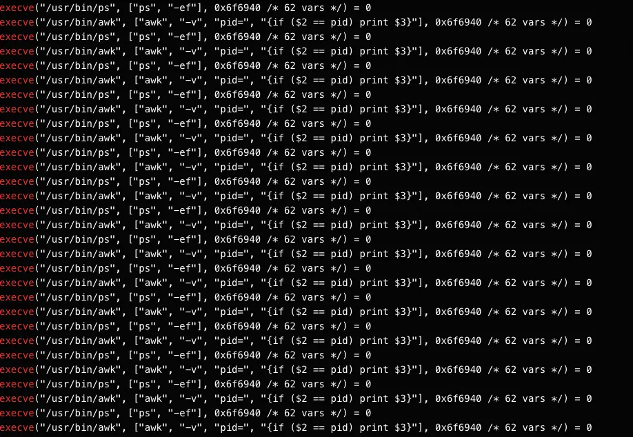 我们了解到,Shell 脚本是通过 execve 系统调用来执行 Shell 命令的,因此我们使用 strace 来跟踪 execve 的调用。从下面的结果图中可以看出,该脚本正在不断重复执行 ps 和 awk 命令。然后在 shell 脚本源码内搜索 ps 和 awk,很轻松定位到问题源码。