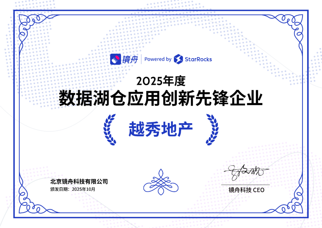 近日,镜舟科技发布“2025 年度数据湖仓应用创新先锋企业”奖项,作为中国第一代商品房缔造者和全国综合性房企领军者,越秀地产凭借其在数据湖仓建设与应用方面的卓越实践成功入选,为房地产行业的数字化转型树立了标杆。