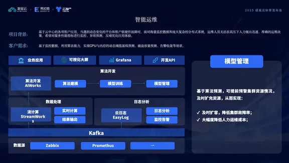 方案:为其构建了一套完整的“智能运维” 体系。1. 数据源:接入 Zabbix 、Prometheus 等监控数据。2. 数据处理:通过 Kafka 接入“云日志 EasyLog” 和“流计算 StreamWorks” 进行“实时计算” 。3. 算法开发:利用“算法开发平台 AIWorks” 进行“算法建模” 和“模型训练” 。4. 业务应用:将“结果输出” (如“监控告警” )对接到“可视化大屏 Grafana” 和“开发 API” 。