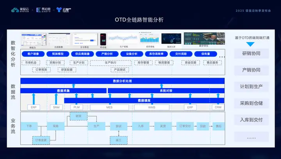 数智化分析(顶层):在统一的数据流之上,构建智能化分析应用。例如“客户画像”、“预测模型”、“供应商画像”、“产能分析”、“设备分析”、“库存周转率”、“交付周期”等。最终实现从“研销协同”、“产销协同”到“入库到交付”的全程可视、可控、可优化。