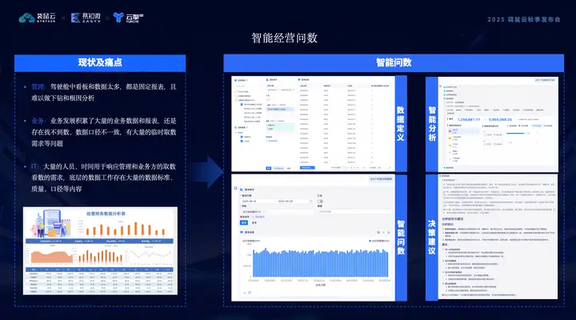 解决方案:方案提供的“智能问数” 能力超越传统 BI。用户不再需要拖拽报表,而是可以直接用自然语言提问,例如:“近 3 个月每日销售额”。系统会“分析用户诉求”、“检索指标”、并“查询数据”,返回精准的图表。更重要的是,AI 会进一步提供“分析结论与建议”,真正实现从“数据定义” 到“智能分析” ,最终辅助“决策建议” 的闭环。