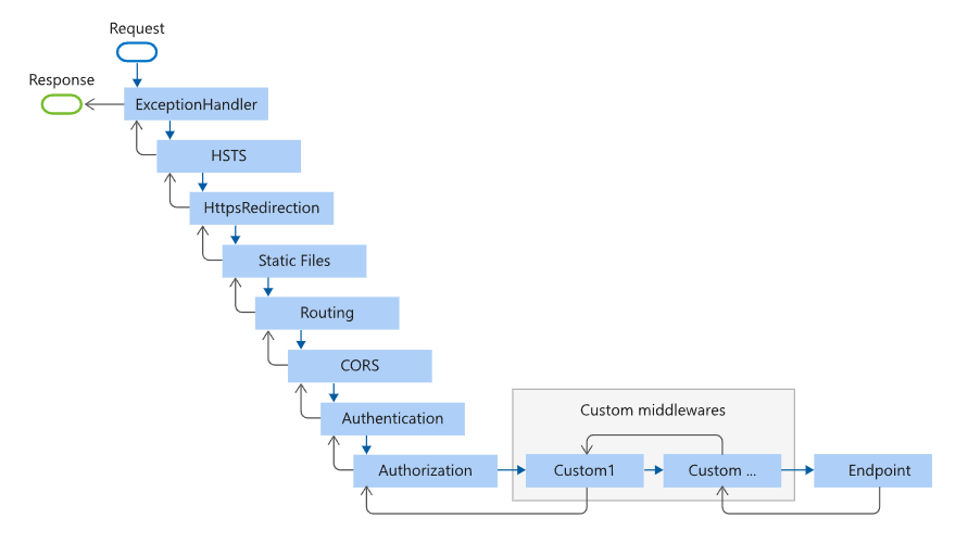 下图显示了 ASP.NET Core MVC 和 Razor Pages 应用的完整请求处理管道: