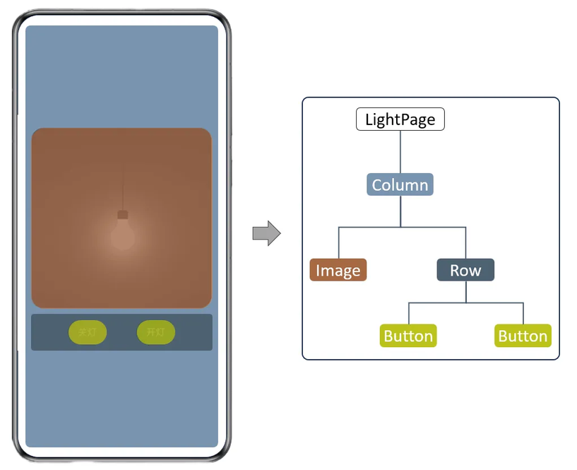 现在需要对前文的开/关灯的案例做出如下改造,由于两个按钮的结构十分相似,所以可考虑自定义一个按钮组件,然后进行复用。