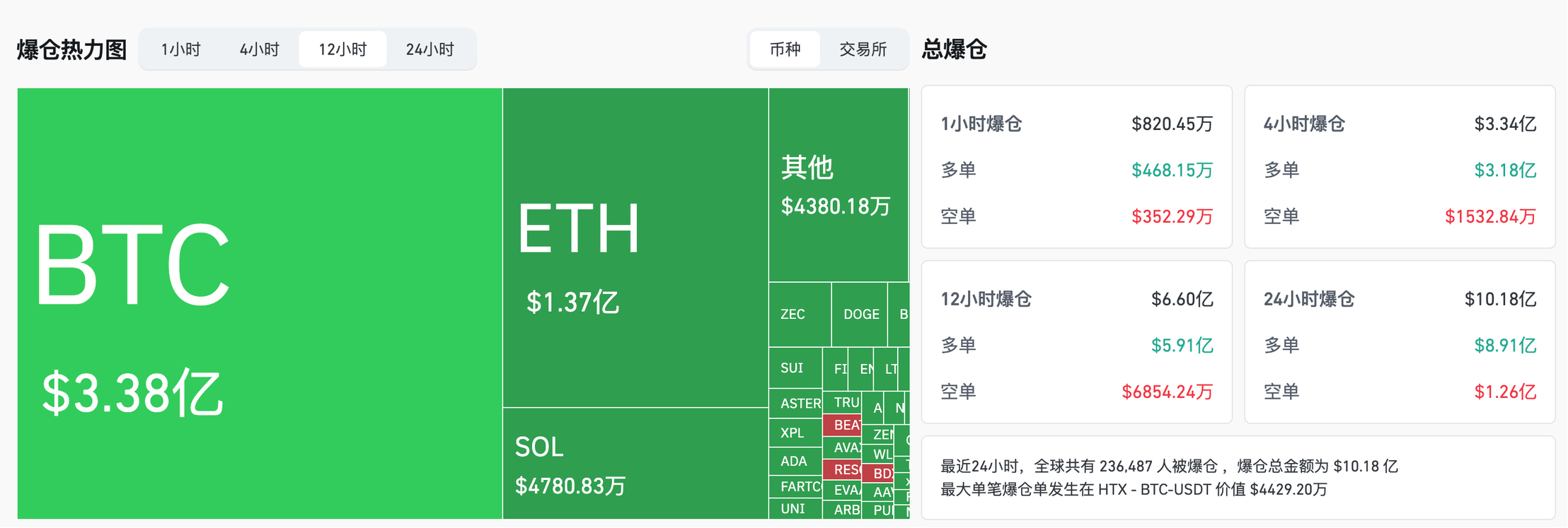 据 Coinglass 数据,截至撰稿时,过去 12 小时全网爆仓金额达到 6.6 亿美元,多单爆仓约 5.91 亿美元,空单爆仓约 6854 万美元。其中比特币和以太坊成为爆仓「重灾区」,多单爆仓金额总计超过了 4.2 亿美元。