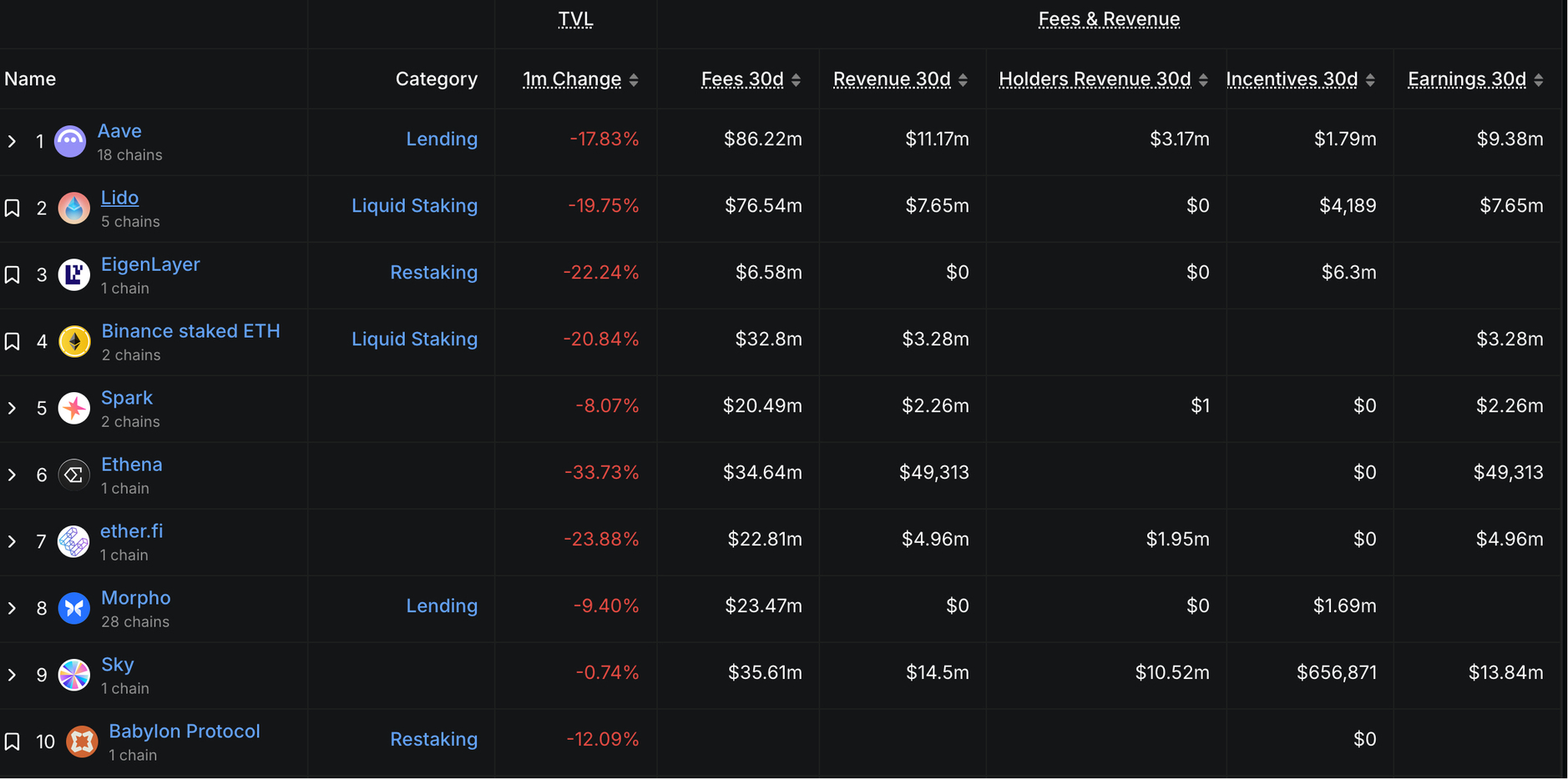 与此同时,加密市场的其他板块(如 DeFi、NFT 和 RWA 等)也无法独善其身。DeFi 总锁定价值(TVL)已从近期峰值 1721.16 亿美元一路下滑至 1292.75 亿美元,过去 30 天内,排名前十的 DeFi 协议 TVL 无一幸免,全部出现下跌,其中 Ethena 跌幅一度超过 30%。