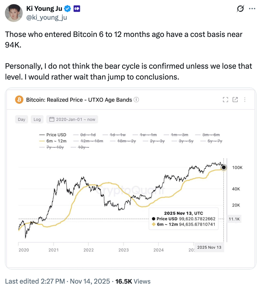 CryptoQuant 创始人兼 CEO Ki Young Ju 则发推称,过去 6 至 12 个月入场的比特币投资者,平均成本大致在 94000 美元附近。他指出,只有当价格跌破这一成本区间时,熊市周期才可能得到确认,目前切不可过早下结论。