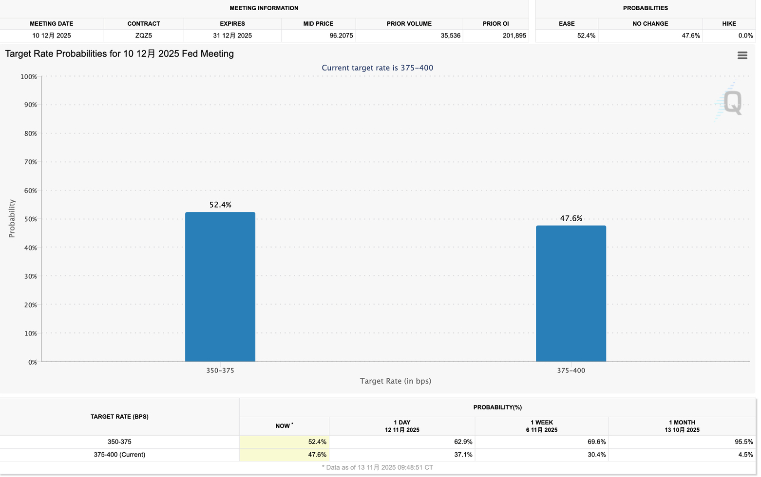 从 CME「美联储观察」的数据变化中,可以清晰看出市场对美联储降息预期的转变。当前,美联储 12 月降息 25 个基点的概率仅为 52.4%,而一周前这一概率还接近 70%,一个月前更是高达 95.5%。野村证券甚至断言,美联储 12 月将暂停降息。