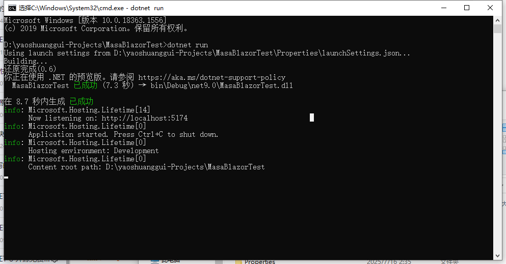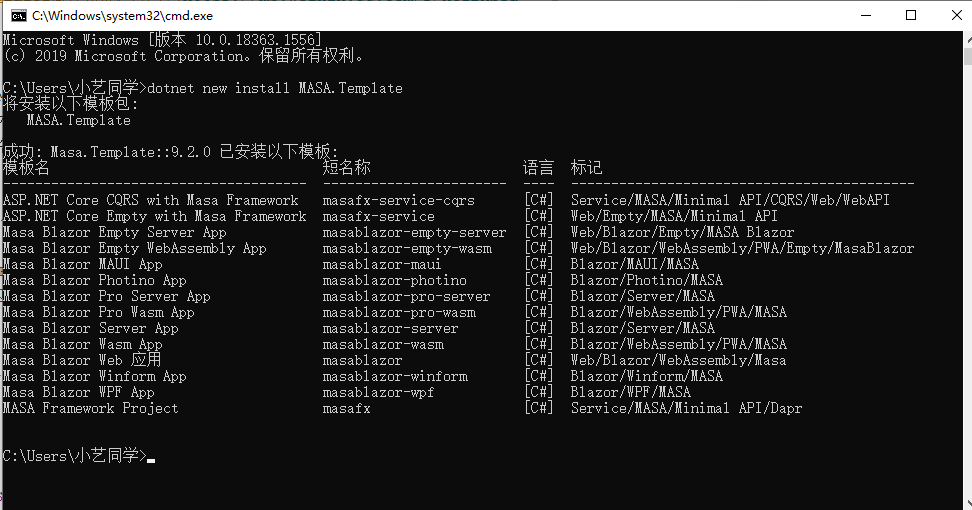 以 masablazor-server 模板为例,创建项目,并使用 -o 指定输出目录和项目名称。